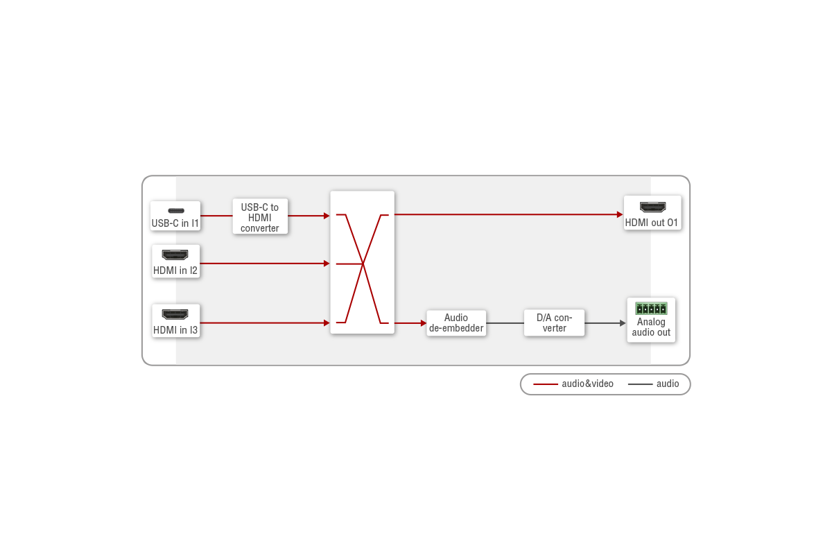 The switcher thrives when it comes to audio capabilities, offering analog audio de-embedding.