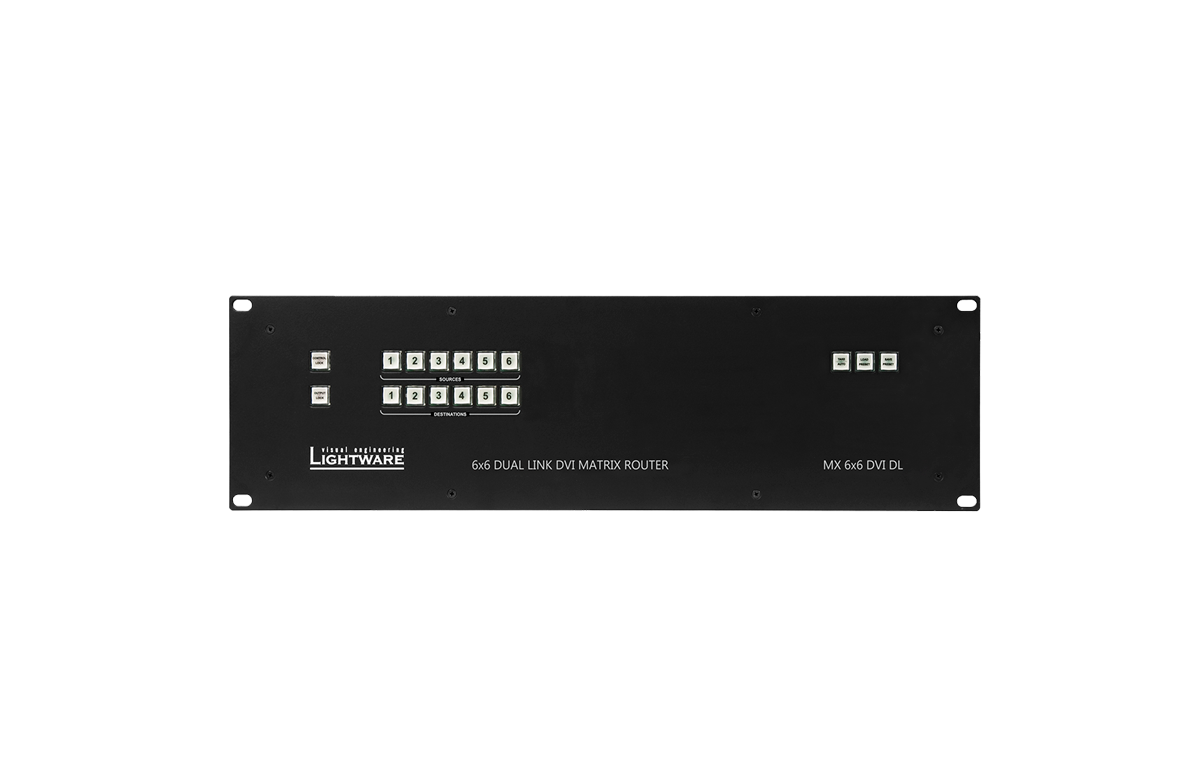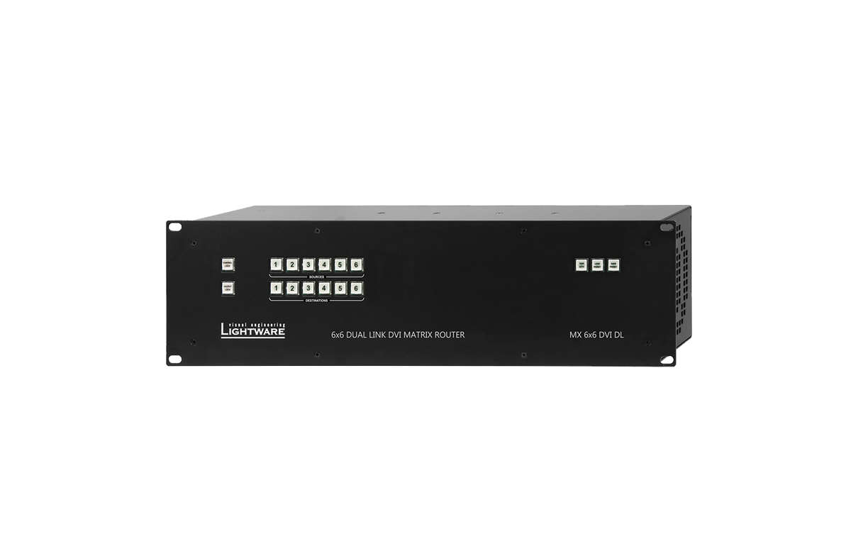 Lightware MX6x6DVI-DL is a four input four output Dual-Link DVI crosspoint matrix switcher supporting all DVI resolutions coming from PC VGA cards or other DVI sources. It accepts the highest available computer resolutions from 640 x 480 to 3840 x 2400 including all HDTV resolutions: 720p, 1080i, 1080p, 2K and 2560 x 1600. The DVI matrix router can route 4 DVI Single-Link or Dual-Link signals to any 4 displays for example LCD monitors, plasma displays or projectors. All outputs support 500 mA power on DVI +5V pin to power fiber optical DVI cables.