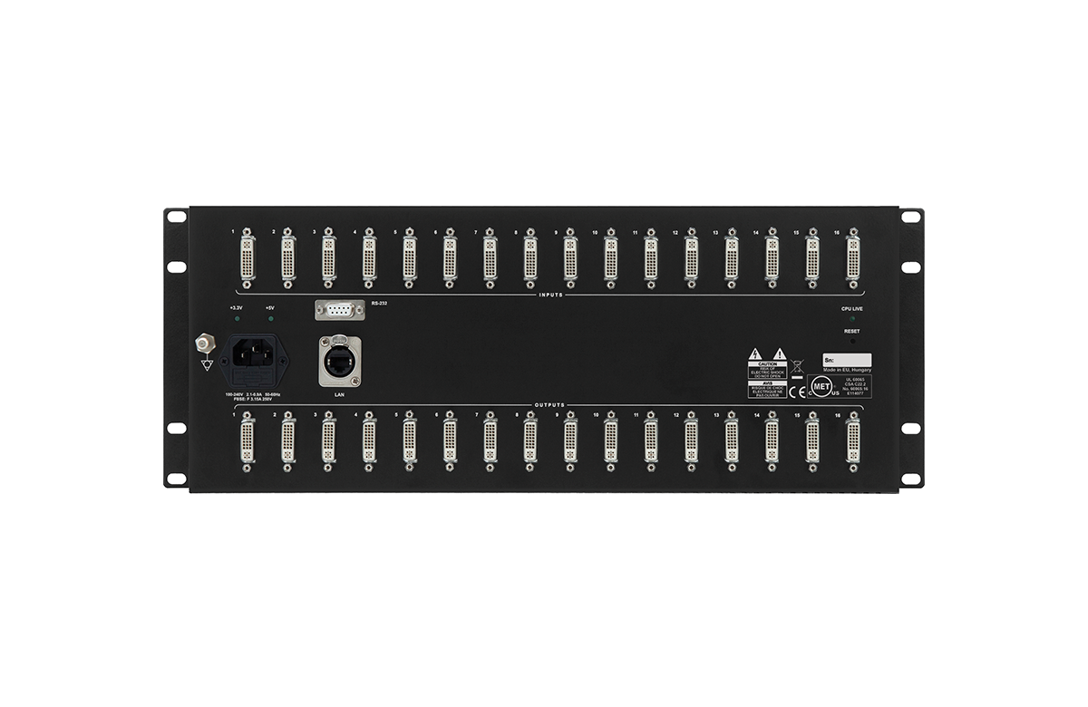 The 7 inch depth, 4 RU high body and low noise fan design makes it ideal for many space and noise sensitive applications. The frames incorporate Lightware’s Advanced EDID Management function. The user can emulate any EDID on the switcher's inputs independently, read out and store any attached monitor's EDID in 100 internal memory locations, upload and download EDID files using Remote Control software. The crosspoint switcher can be controlled through a 9-pole D-sub connector via RS-232 or RS-422 protocol, and IP based Ethernet connection including web access through a Neutrik EtherCON connector which ensures a robust connection at all times.