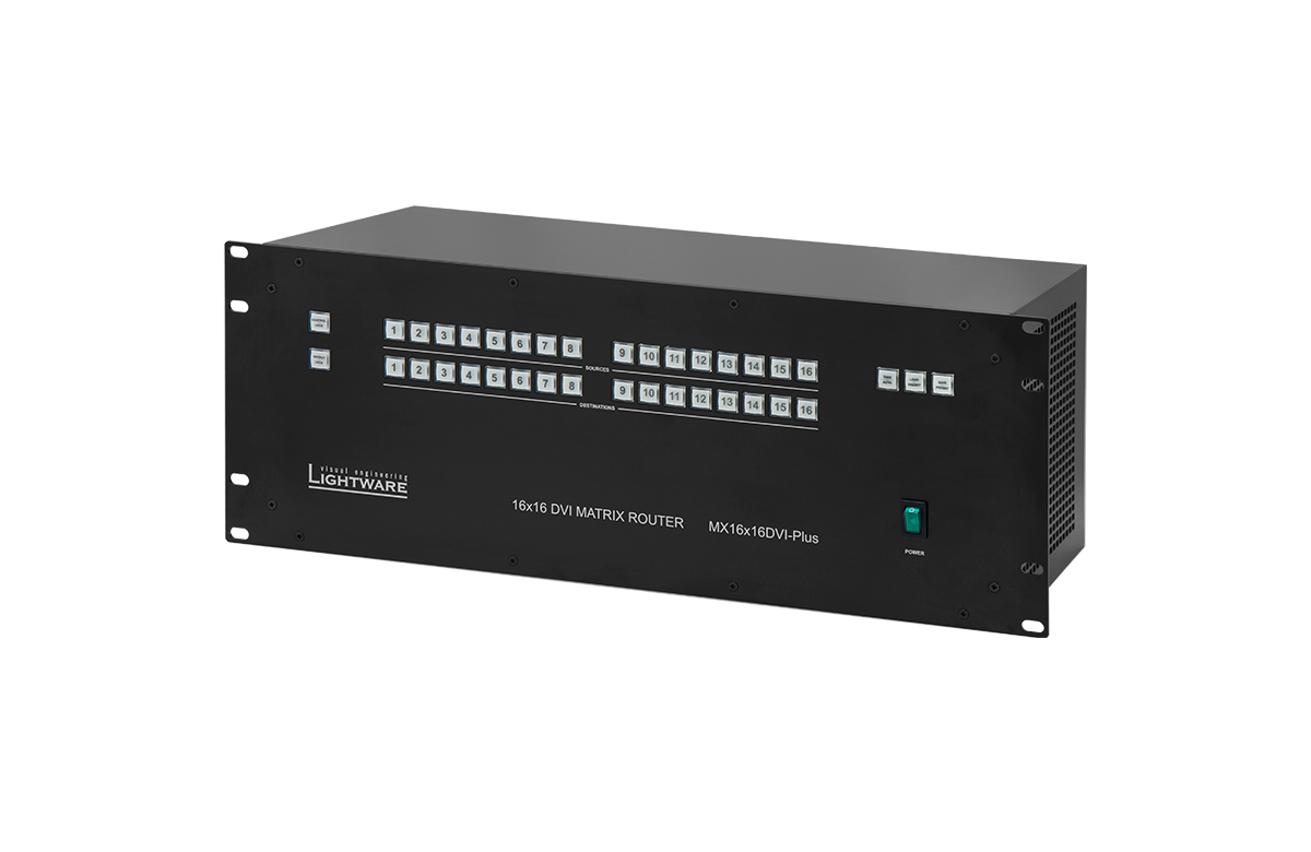 The MX16x16DVI‑Plus cost‑effective matrix switcher range from 16 input 16 output. The Plus series switchers are based on the Slim matrices with the added benefits of the integrated power supply insuring reliable performance in the most harshest environments. The 7 inch depth, 4 RU high body and low noise fan design makes it ideal for many space and noise sensitive applications.