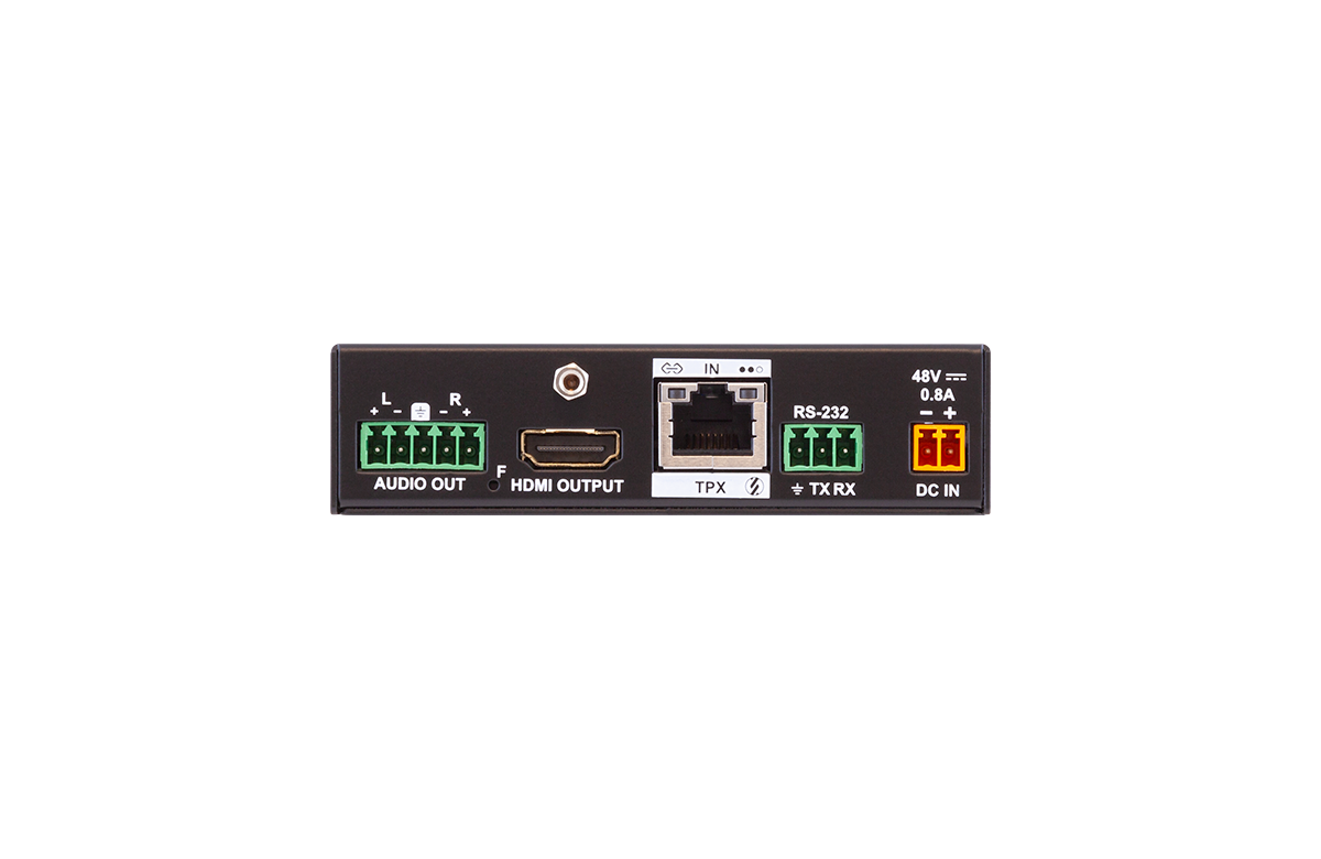 The HDMI-TPX-RX109AK-V2 receiver with AVX technology allow users to extend HDMI 2.0 signals up to 4K60 4:4:4 video resolution through a single CATx cable over distances up to 100 meters. It features a stereo analog audio output for audio content generated from the audio in the input HDMI stream for feeding local audio receivers, and a local HDMI video connector for monitoring or loop-through connection is also a valuable addition that makes this device even more versatile.