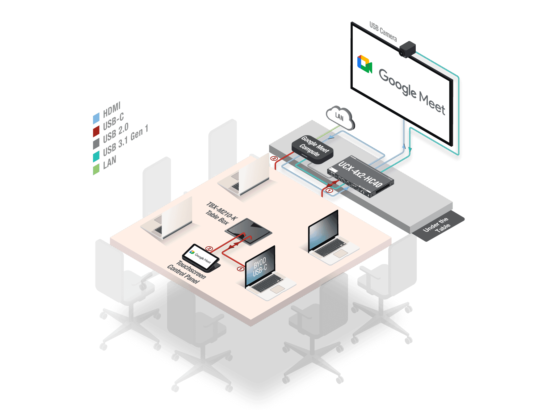 No Network connection required: The Taurus connects to the Google Meet Hardware via USB, requiring no additional network setup.
