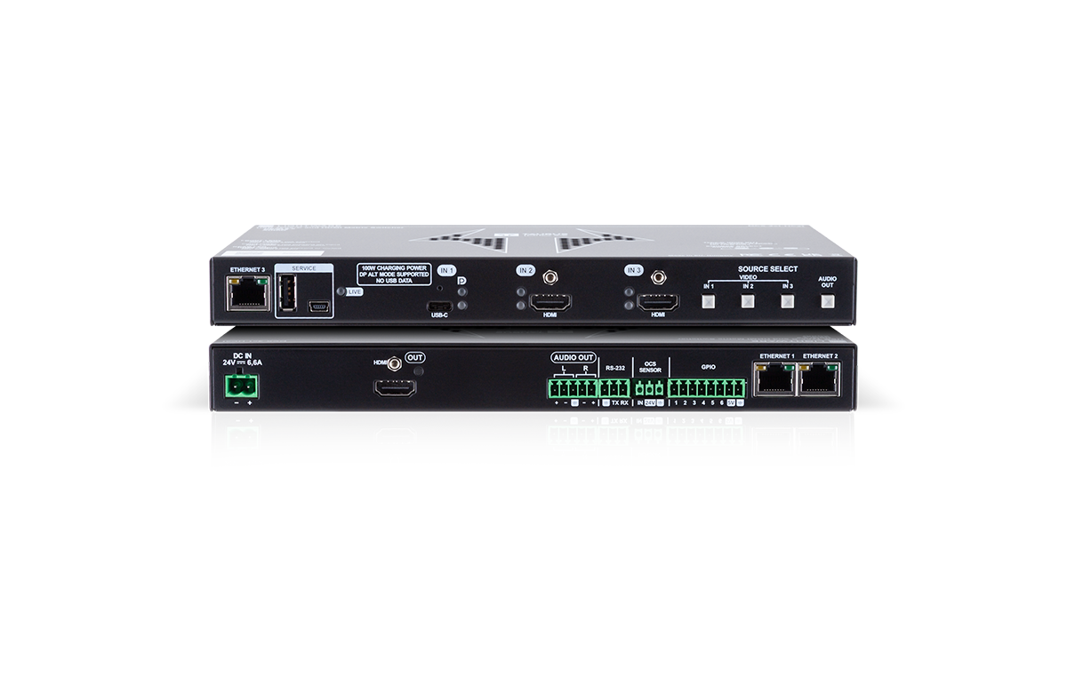 In its class of professional BYOD USB-C matrix switchers, the HC60 series uniquely combines DSC over DP Alt Mode, full-bandwidth USB 3, host switching, and integrated Ethernet. DSC (Display Stream Compression) enables 4K60 4:4:4 video on just two DP lanes, leaving the remaining lanes available for super-speed USB 3, so a single USB-C cable can deliver premium video and professional-grade USB peripherals simultaneously.